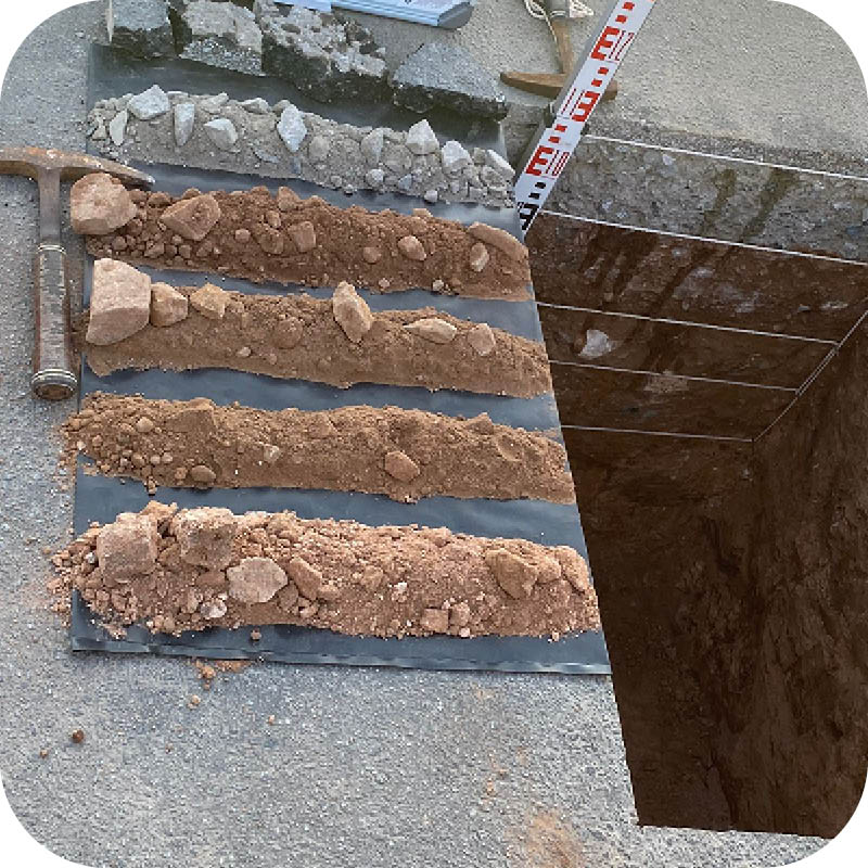 Hand-dug test pits allow for direct observation and analysis of soil strata and conditions.