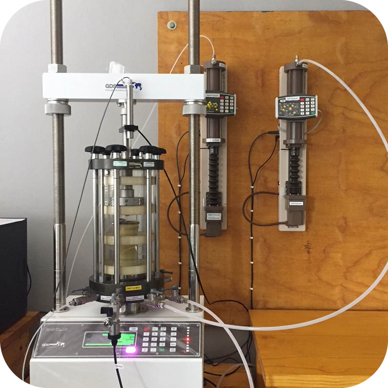 Triaxial Testing (CD, CU, and UU) evaluate soil strength, deformation, and pore pressure under simulated field conditions. Multistage triaxial testing provides a detailed understanding of soil behavior under various stress levels.