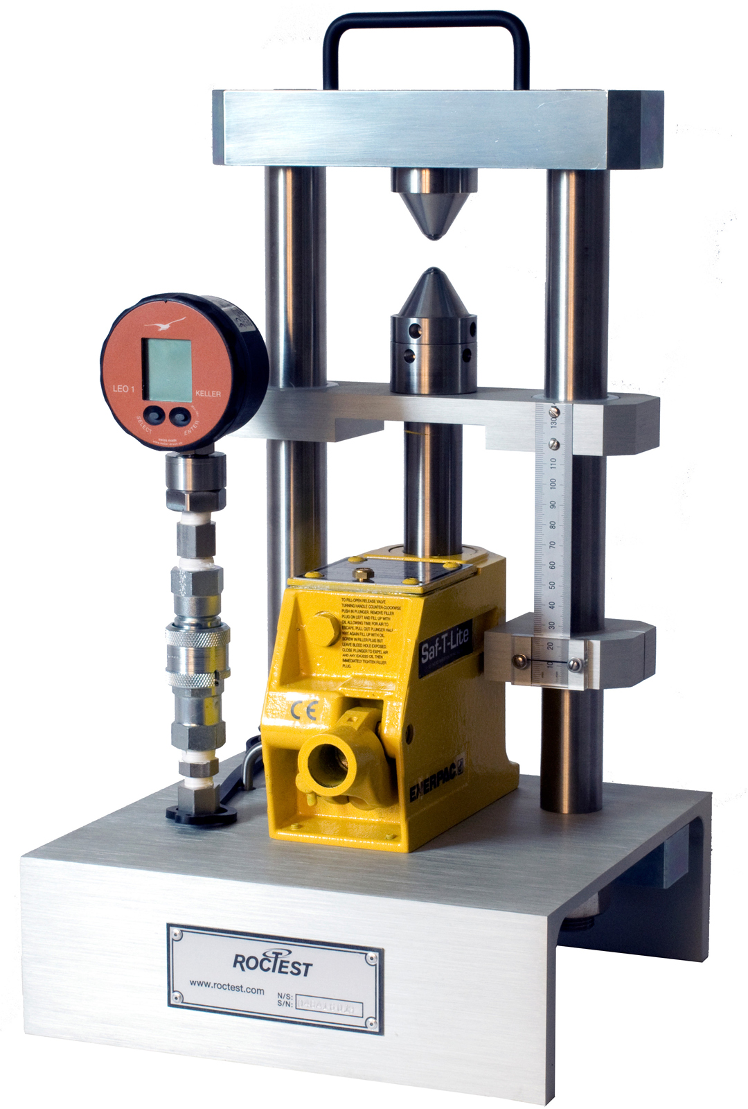 A rock sample is placed between two conical platens and loaded until it breaks. The force at failure is used to calculate the Point Load Strength Index which reflects the rock’s resistance to concentrated loading.