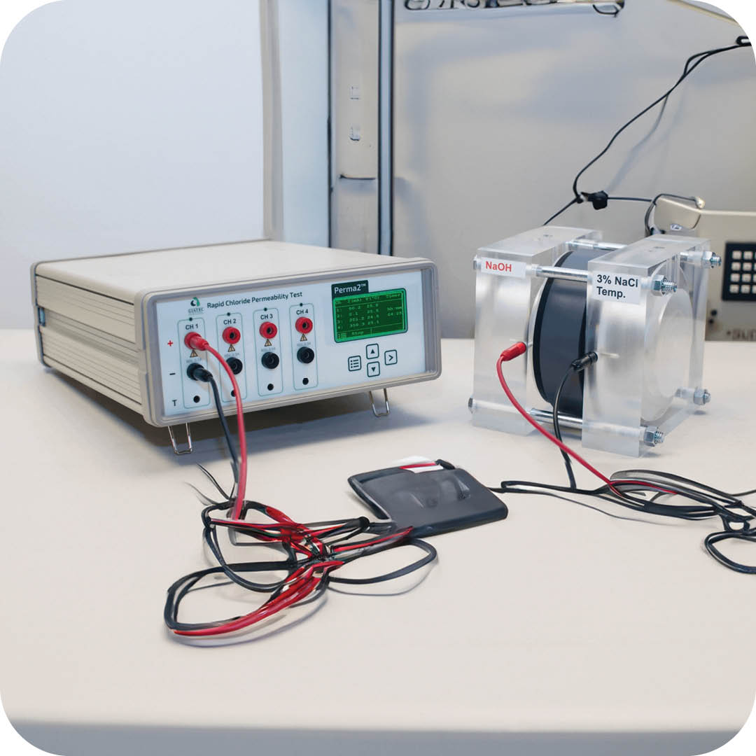 Durability tests include evaluating resistance to chloride ion penetration, which is critical for structures exposed to de-icing salts or marine environments. Chloride ions can cause corrosion of steel reinforcement, leading to structural deterioration. Tests like Chloride Conductivity, Oxygen Permeability and Water Sorptivity help to ensure durability specifications have been attained.